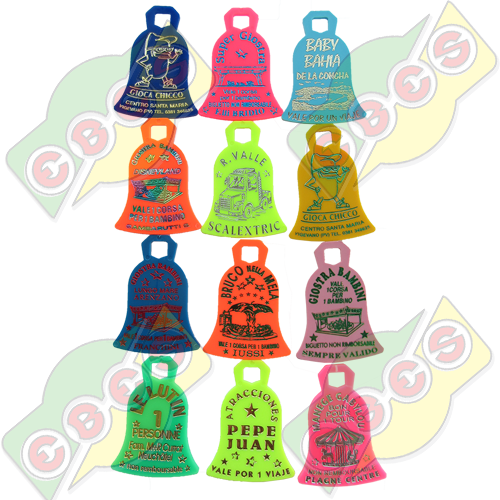 Biglietti in plastica relizzati in materiale ABS anti-urto ed atossico a forma di Campana di misure 40 x 55 x 1,9mm , disponibili in confezioni minime senza incisione di Kg 5, oppure personalizzati tramite impressione a caldo. Il quantitativo minimo per personalizzazione è di 1000 fiches e suoi multipli.